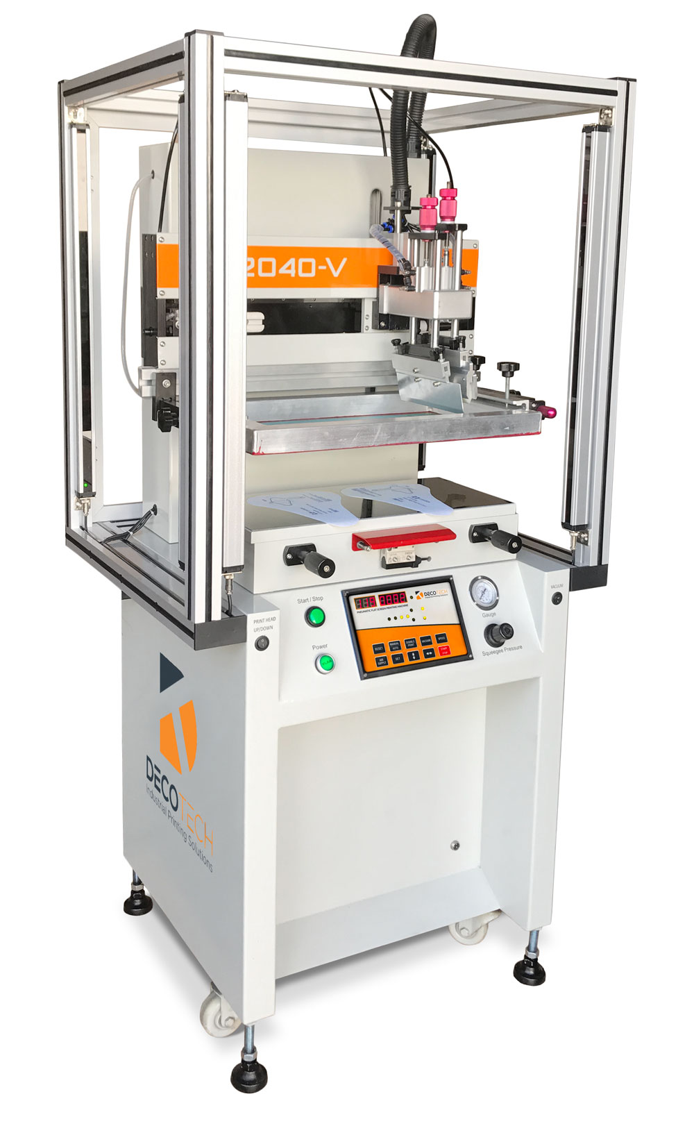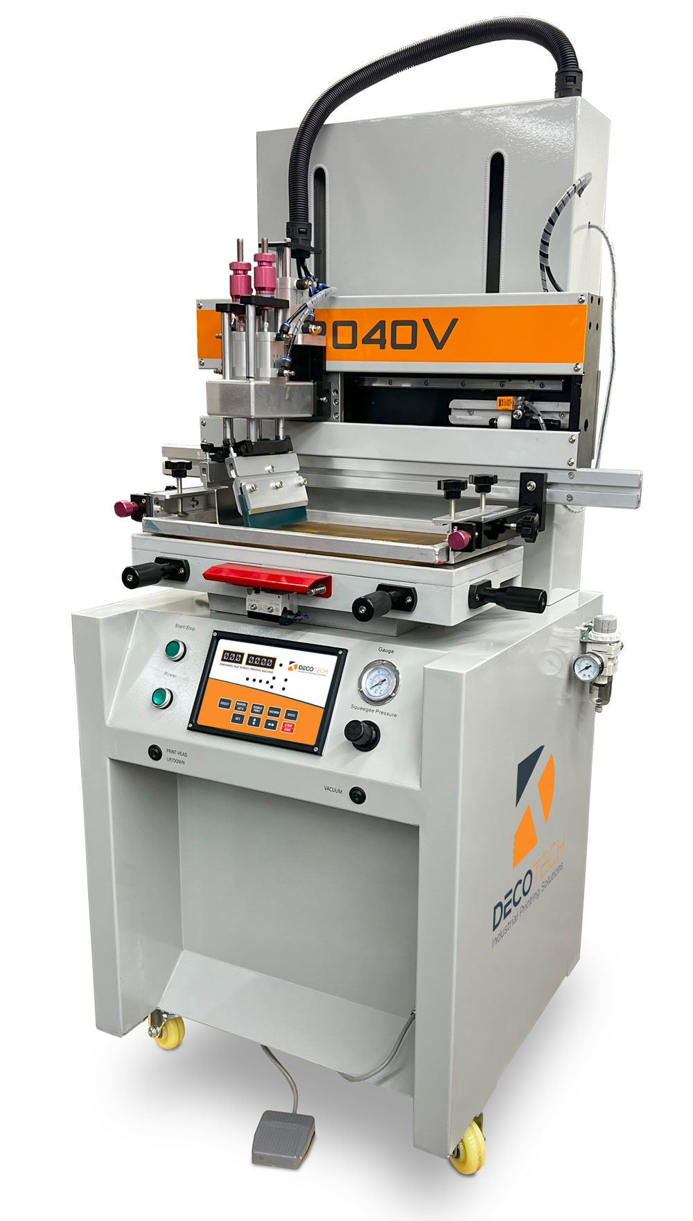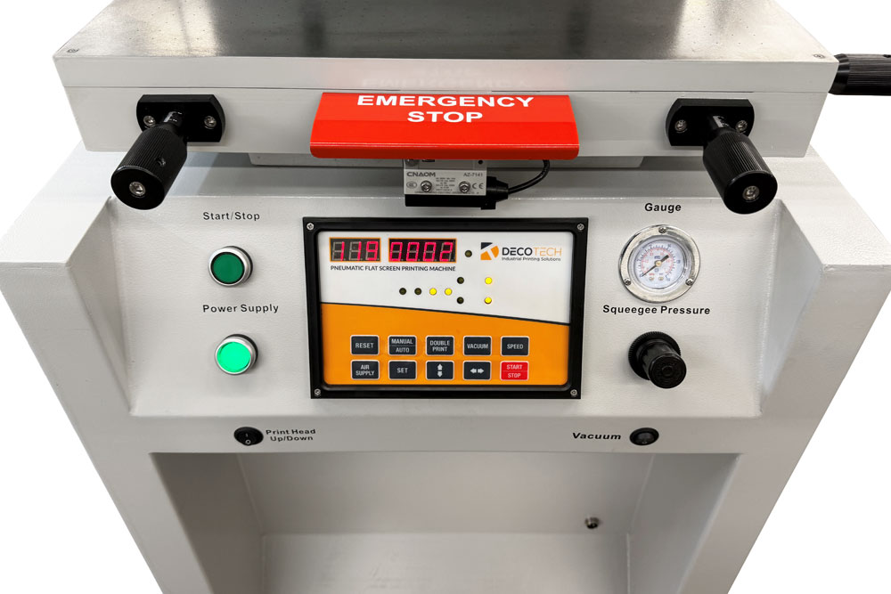 The Deco Tech model DT-2040 is a compact standalone semi-automatic flatbed screen printer that features a smooth operating Festo brand pneumatic drive system for both the vertical and horizontal strokes. The screen frame is lifted up & down vertically, which keeps the screen printing ink in the "print zone", making this a much better design than a clam shell style screen printing press, where the ink constantly runs to the back of the screen frame. Furthermore, this flat vertical screen lifting method allows the operator to better view the parts being loaded and unloaded for faster visual inspection.