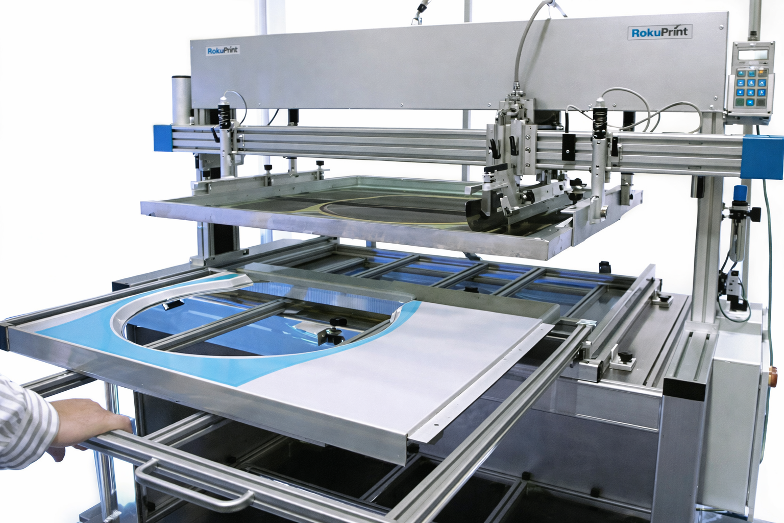 New for 2023 is the RokuPrint model RPX 700.4 (replaces the RPX 700) and the RPX 800.4 (replaces the RPX 800) which are two models of the precision German built RokuPrint flat-bed screen printing machines that are DC motor driven (dual axis X and Z) and these screen printing machines are accurate and precise, and all job data (up to 105 jobs) can be stored in the PLC for fast set ups. These XL format screen printing presses are perfectly suited for screen printing onto large appliance panels, powder coated panels, aerospace and aircraft panels, exterior automotive components, and other industrial graphics. Also, the RPX 700.4 and RPX 800.4 can be outfitted with a powerful vacuum table for screen printing onto flat plastic sheets such as non-slip floor graphics, interior and exterior signage and much more.